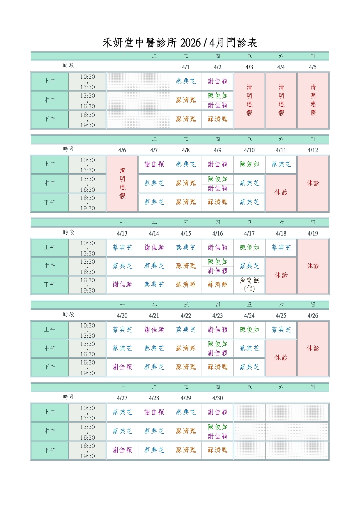 4月門診表